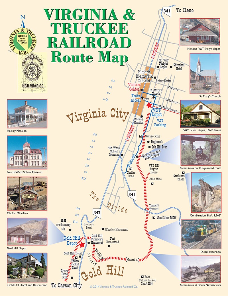 This is the route map for the Comstock Train route that boards in Virginia City, Nevada at the historic 1870 V&T Depot. The Comstock Train provides a 35-minute round trip to Gold Hill.