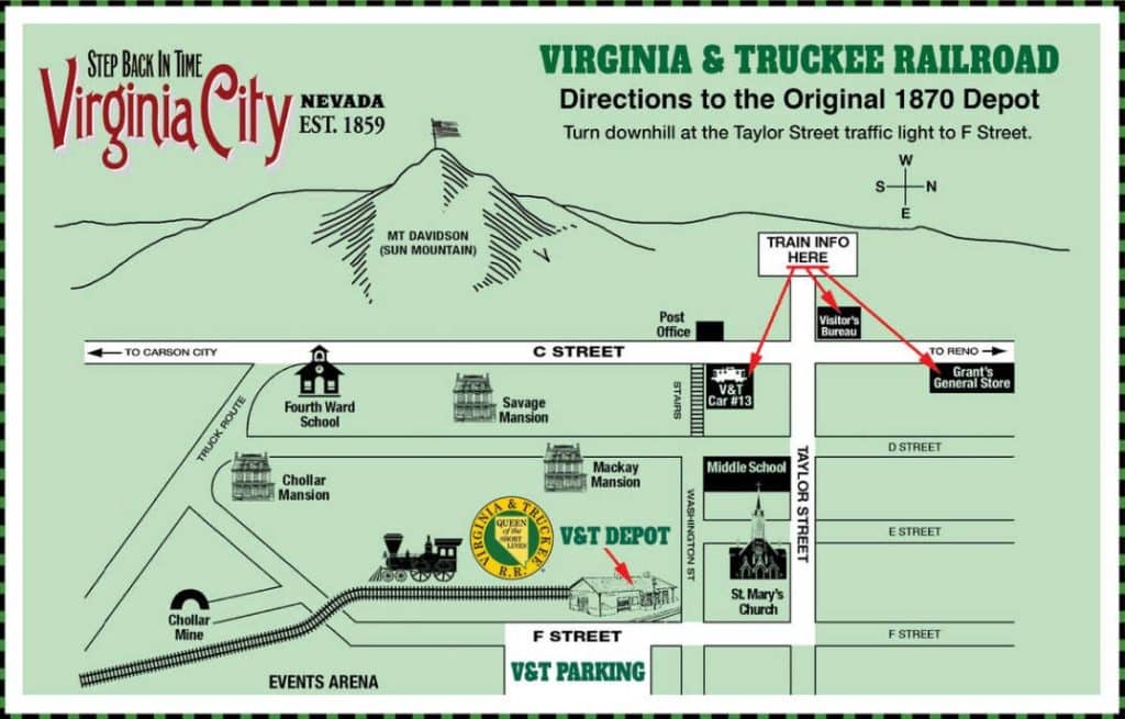 Come to Virginia City and, if we have our way, ride the train! But even if you don’t ride our railroad, our 1870 historic passenger depot is still worth visiting! It’s a very short mostly level walk from St. Mary’s in the Mountains Church to our Depot. Also, there’s free parking across the street from the Depot.